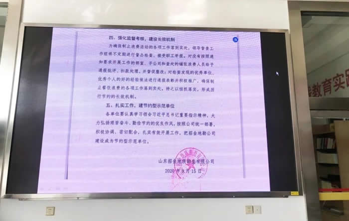 通过召开会议、大屏幕滚动指示文件等方式,提高广大干部职工勤俭节约的意识,同时鼓励广大员工培养文明就餐好习惯,杜绝浪费,鼓励光盘行为。