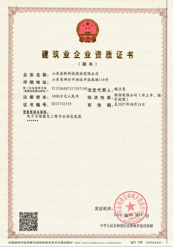 近日,经山东省住房和城乡建设厅批准,山东金软科技股份有限公司顺利取得“电子与智能化施工贰级资质”,此